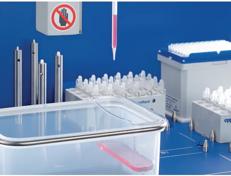 机械手工具可以在 epMotion 5073 或 5075 工作板位上递送耗材。 可自动切换并加载工具,软件编程也是简单易用。 可以堆叠最多 5 个工作版。